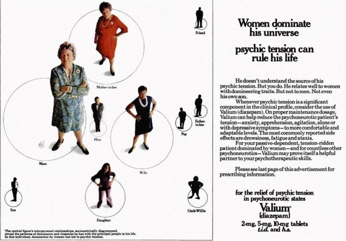 I was amused to spot this vintage ad targeting doctors prescribing Valium (via reddit). Apparently relating well to women with domineering traits was a thing men needed medication for back in the 1960s. It’s a good job we live in (slightly) more enlightened times, or I’d be dosed up to my eyeballs. Although in my case, domineering traits leads to tension that’s more sexual than psychic.