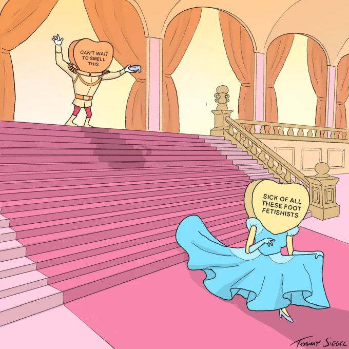Not exactly my usual material, but it made me laugh and it does seem appropriate subject matter. I’m not sure if glass slippers would be great for a foot fetishist (all that collected sweat) or terrible (too impersonal and impervious).