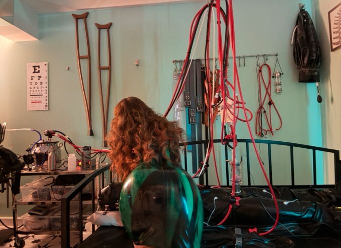 What caught my eye in this image wasn’t the latex, bondage and milking device, yummy though all those things are. It wasn’t even Lady Delphine’s shiny and beautiful bottom or cascading red hair. What caught me eye was the crutches and eye chart on the wall. I can’t imagine they’d ever be useful for a scene, but they do add the appropriate ambience. It’s always nice to see the extra little touches that people bring to a playspace.