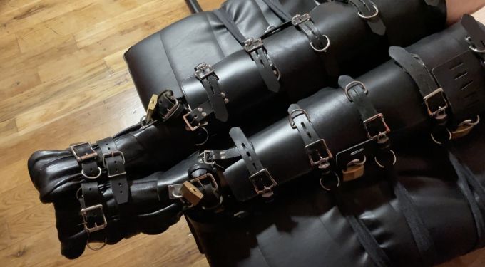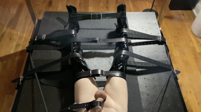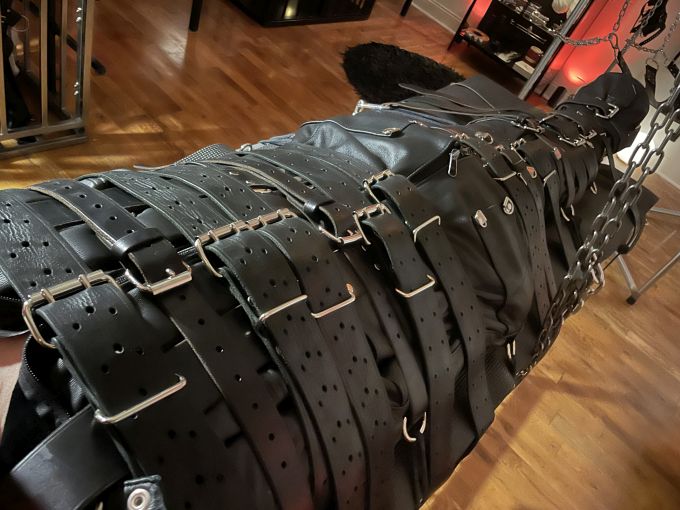 The final scene was on a leather recliner, featuring a beautiful leather straightjacket for my arms and a lot more padlocks (pic 7). My legs were wrapped in leather splints and the feet in leather booties that wrapped back and down, pulling the feet out straight (pic 8). The twist in the tail here was that the recliner seat was motorized, so slightly raising it from the horizontal position shifted the tension in the bondage and stretched me out.