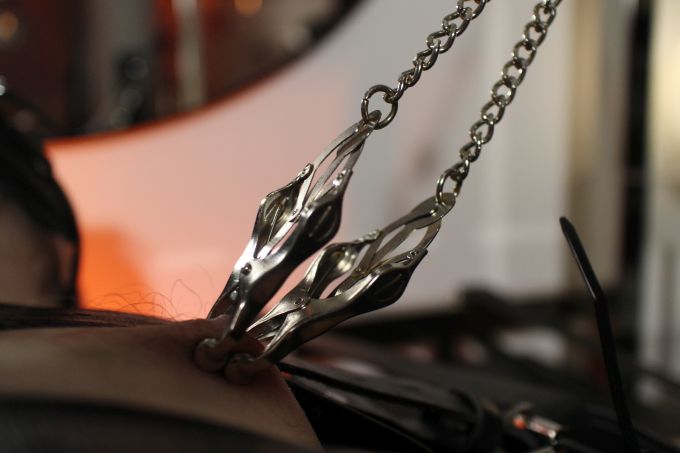 One of the great things about Mistress Tess’s space is the variety of furniture she has, which gives a lot of interesting options. In part 1 (here) I talked about bondage on a chair and a bench. The next set-up we did was on her poster bed, but with a firm board laid out across it. She adopted a different bondage style here – using straps and ropes in a tension with each other. Rather than being encased and strapped down I felt exposed, caught in a tight web that pulled me sideways and inward simultaneously (pic 1). I also got to wear some very sexy boots for this scene (pic 2). With the bondage in place it was time for some nipple torture, with the clamps tied off to the posts of the bed (pic 3). Needles also made an appearance, puncturing another delicate part of my anatomy (pic 4). While the needles look more fearsome, it’s the clamps that really bring the ouch.